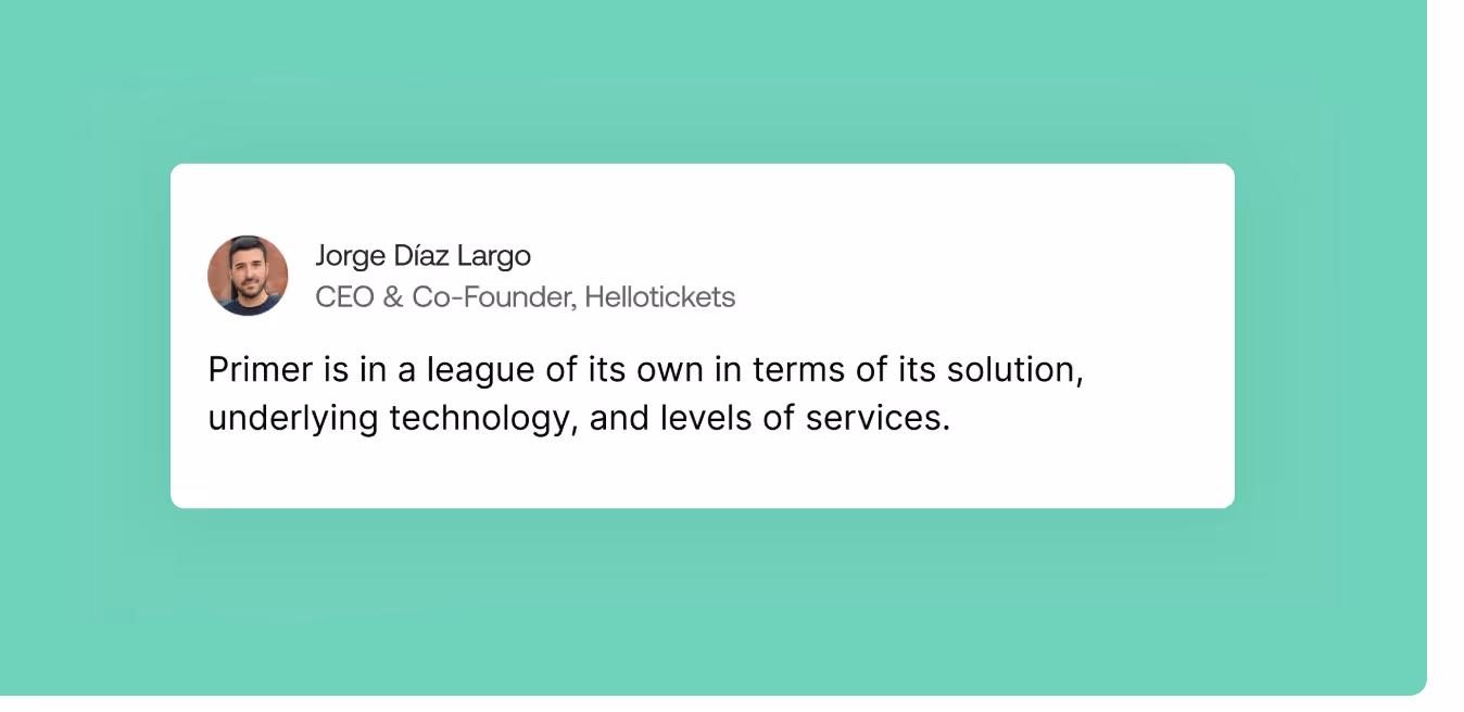 Primer stood out for its ease of use, fast onboarding, and infrastructure that could adapt without compromise. With Universal Checkout, Hellotickets can now create tailored checkout experiences by region, expand local methods like PIX, and consolidate all payment data into one place to inform strategy.