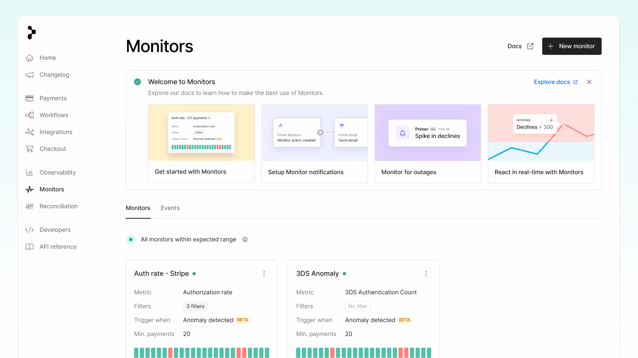 While Observability provides a complete view of your payment data, Monitors keeps you informed about payment trends.