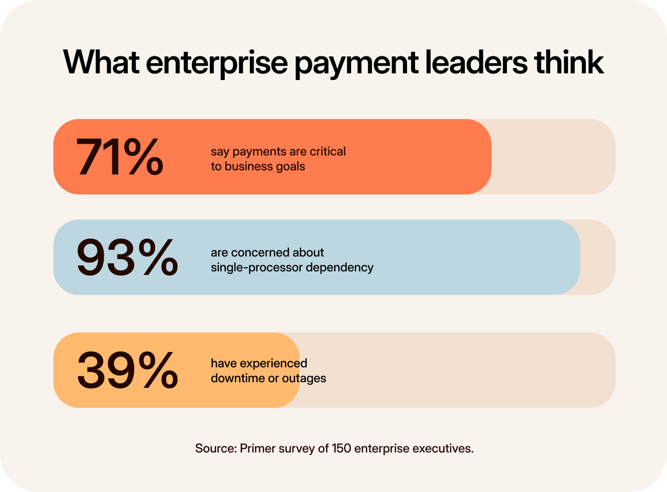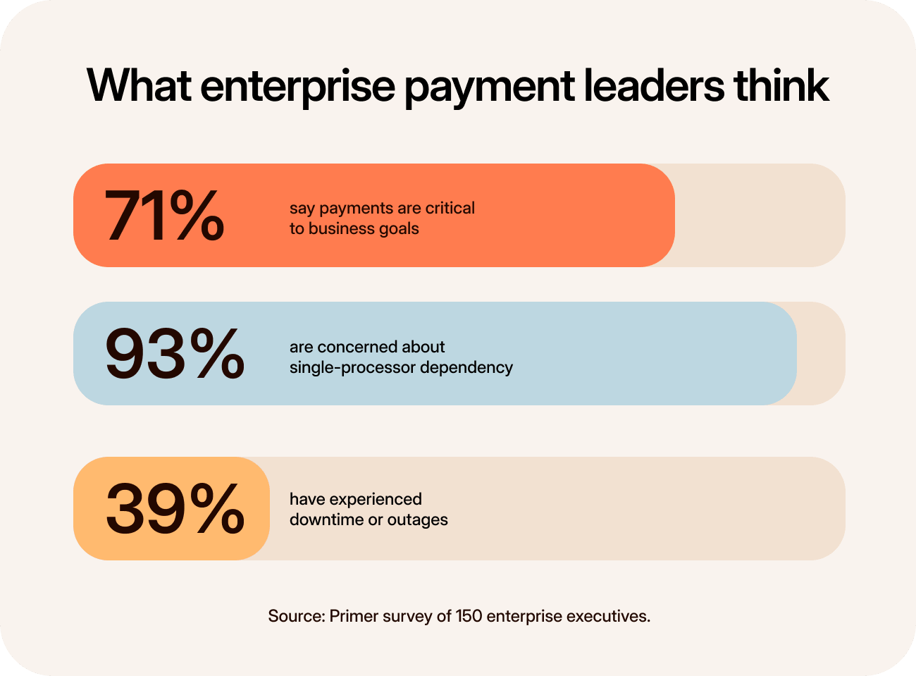 That concern is widespread: 93% of payment leaders say relying on a single processor worries them, with more than half saying they’re very concerned. And for good reason. Processor dependency runs deeper than a technical problem. It’s a continuity risk, a reputational risk, and a valuation risk rolled into one.