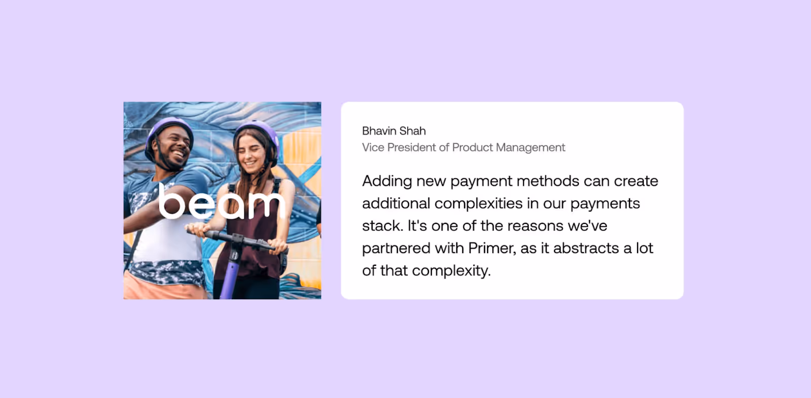 Beam, a micromobility provider operating in eight countries and more than 60 cities, depends on fast and reliable payments to keep riders moving. Since partnering with Primer, Beam has added several alternative payment methods, including Apple Pay and Google Pay in Australia and New Zealand, and KakaoPay and Toss Pay in South Korea.