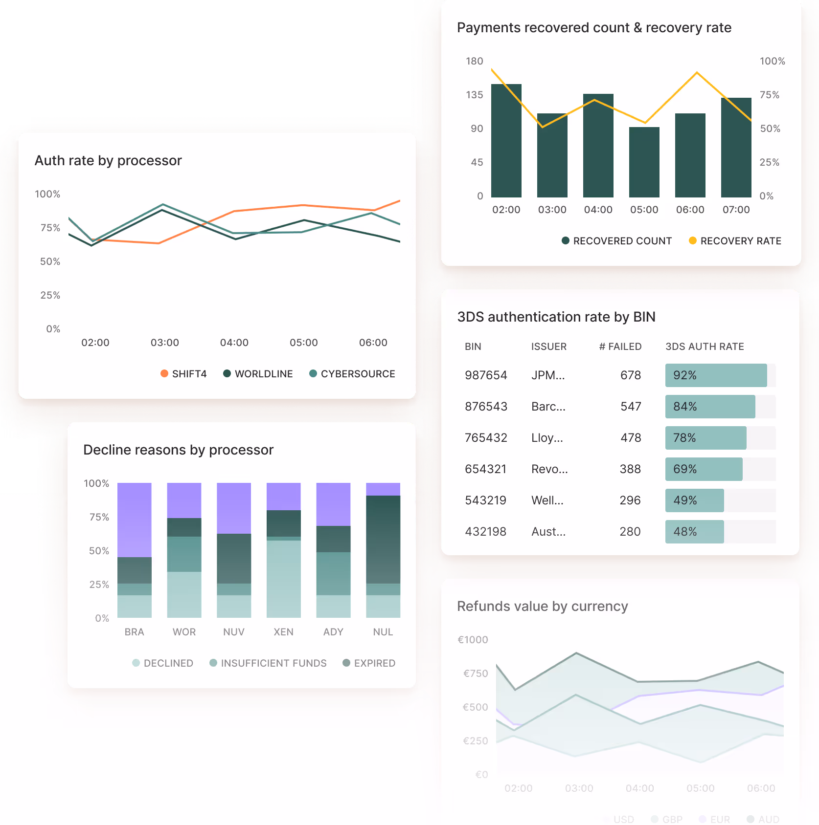 Get full visibility across every transaction, provider, and customer journey - all in one place. Spot issues before they impact conversion. Turn raw payment data into actionable insights for revenue, performance, and uptime.