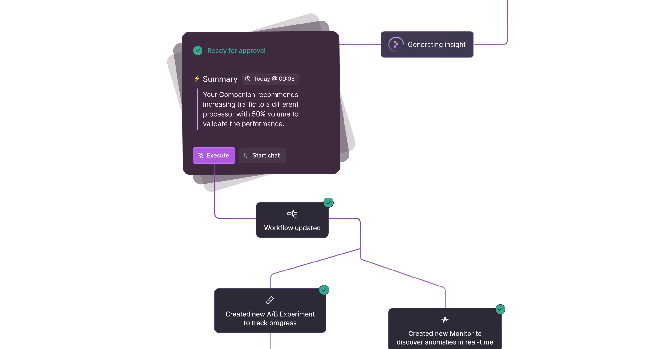 Turn clarity into impact. Your Companion sets up optimizations, routing changes, and experiments, all ready for you to review and deploy, all while being fully in control.