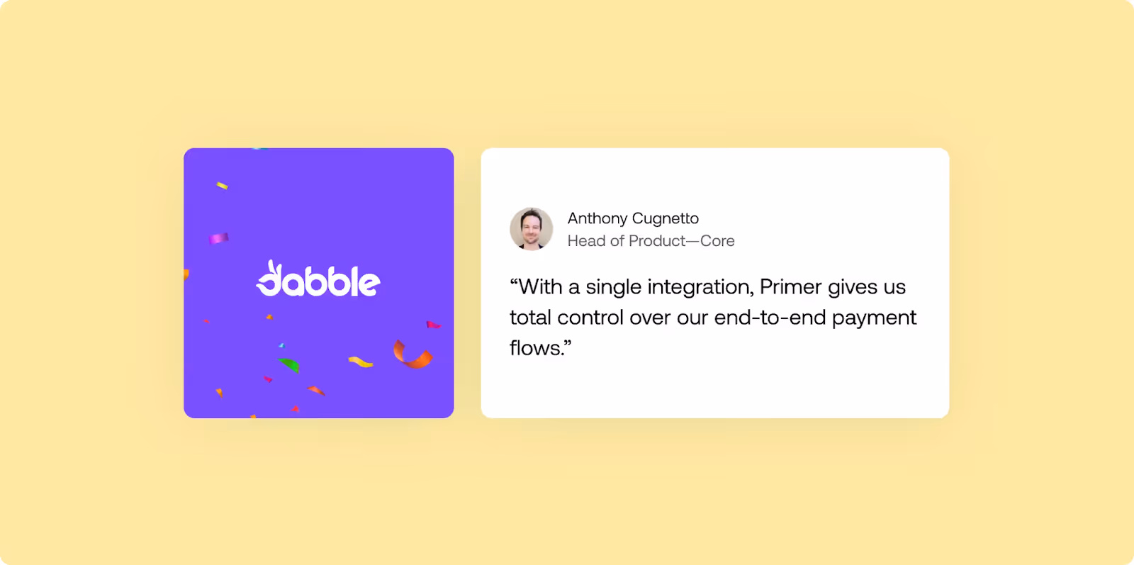 Without the need to rebuild payment logic every time they update their payment stack, Dabble has the flexibility to adapt quickly. They can focus on scaling to new regions, easily adding payment methods and processors as they go.