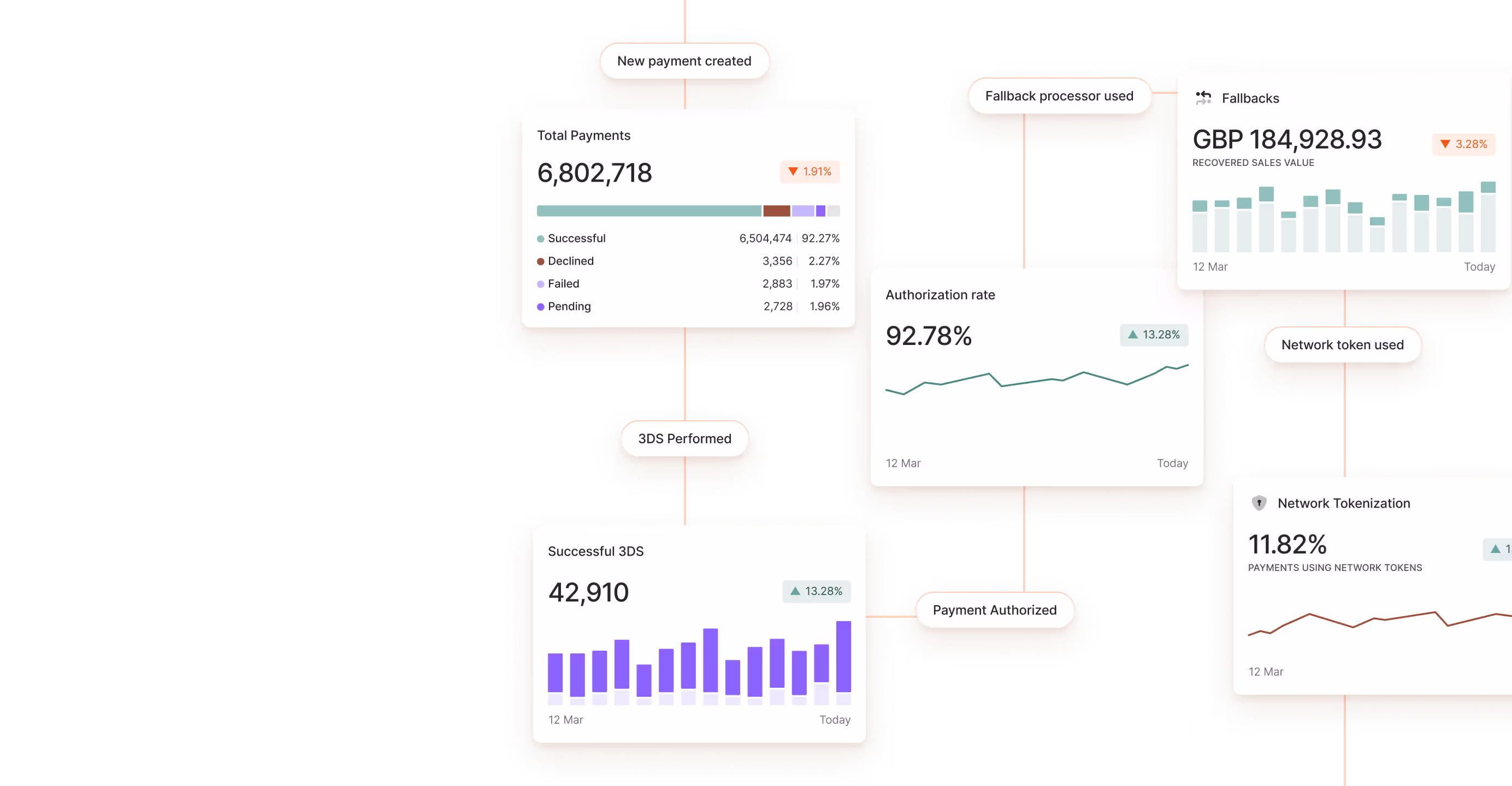 Get full visibility across every transaction, provider, and customer journey - all in one place. Spot issues before they impact conversion. Turn raw payment data into actionable insights for revenue, performance, and uptime.