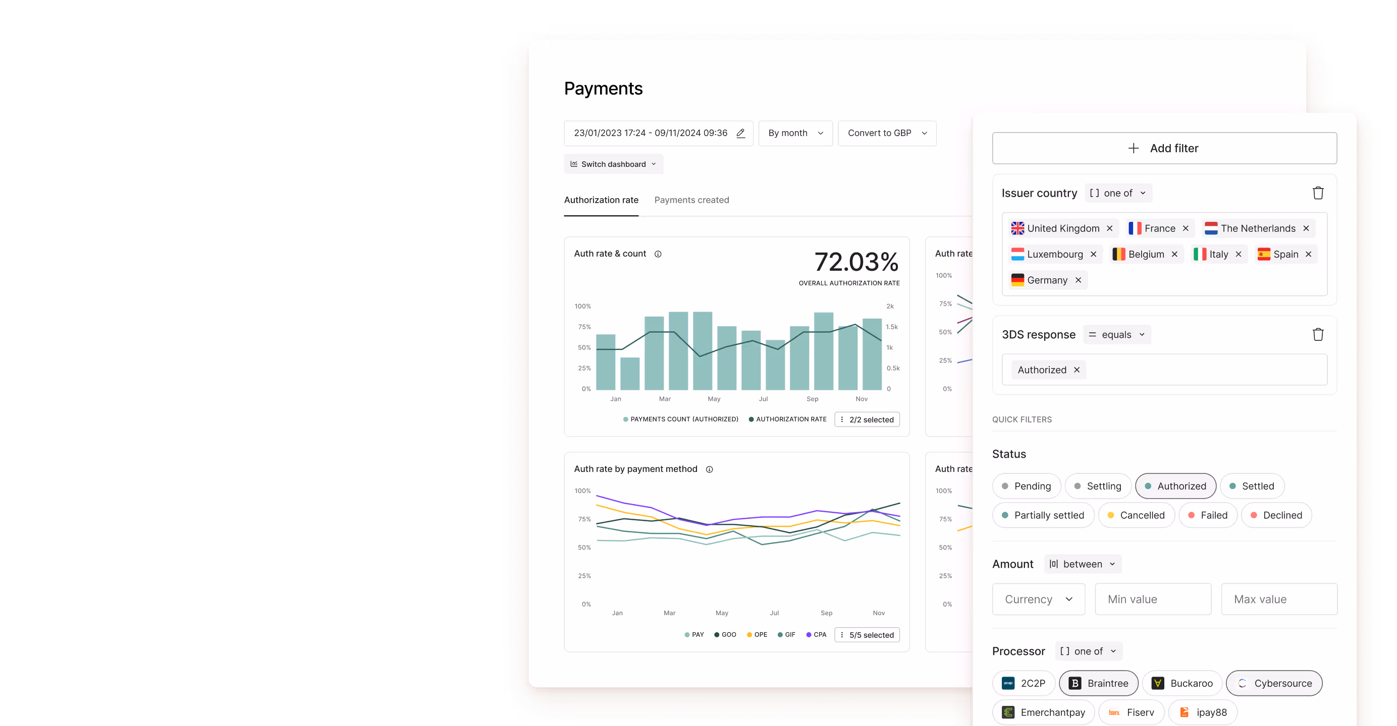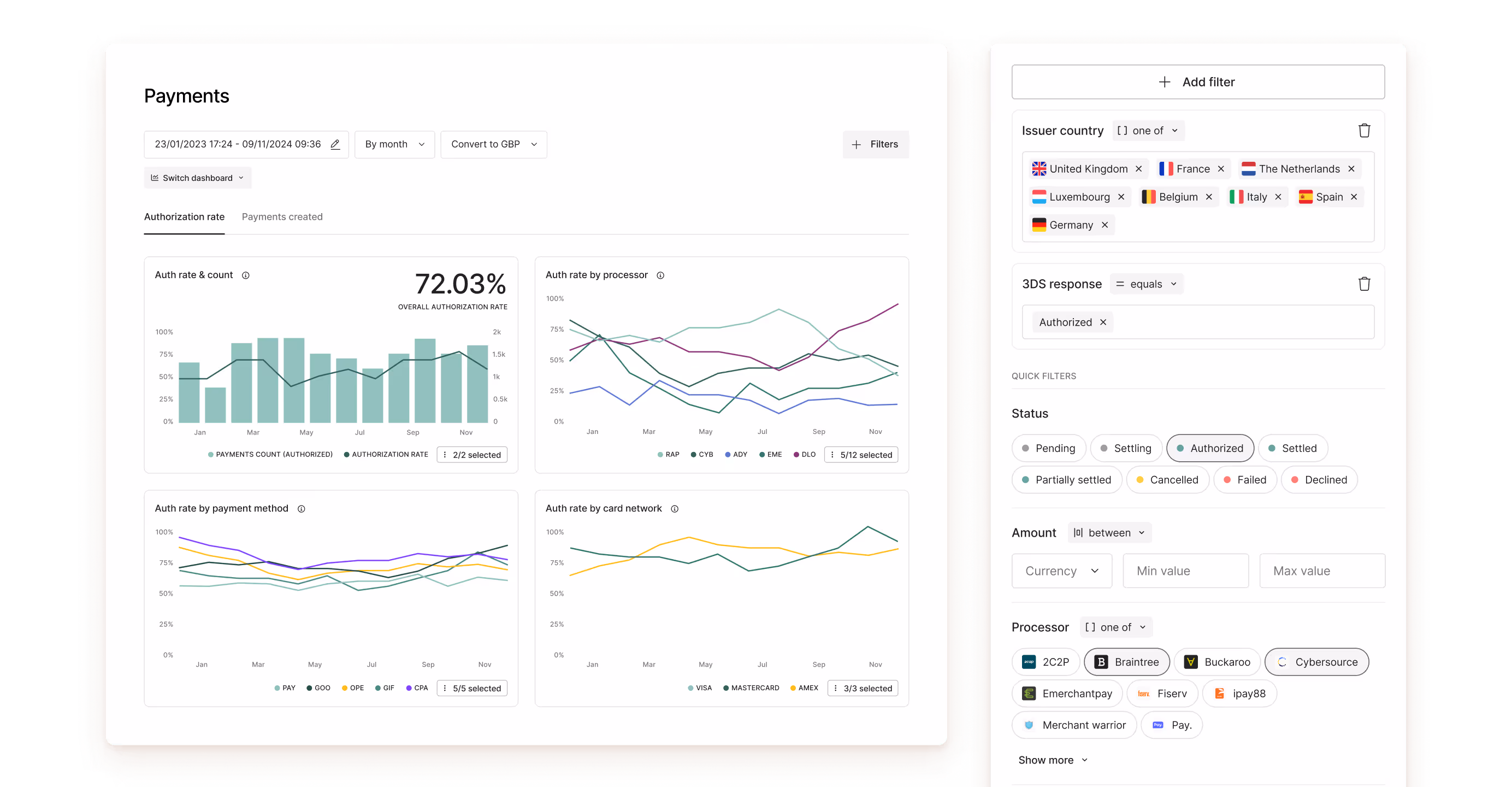 Track dips in approval rates by processor, region, or method - and act before they hit revenue.